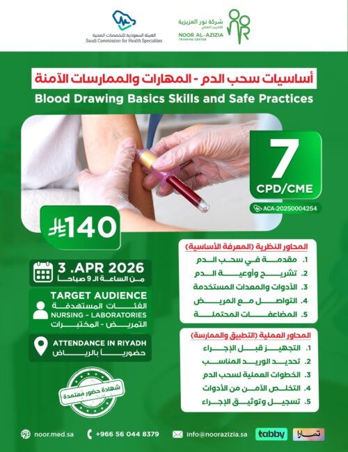 مركز نور العزيزية للتدريب الصحي معتمد من SCFHS من هيئة التخصصات الصحية (ترخيص 1/10168)، متخصص في التدريب الصحي منذ 2017. يركز على الجودة، التميز، والتطوير المهني للكوادر الصحية